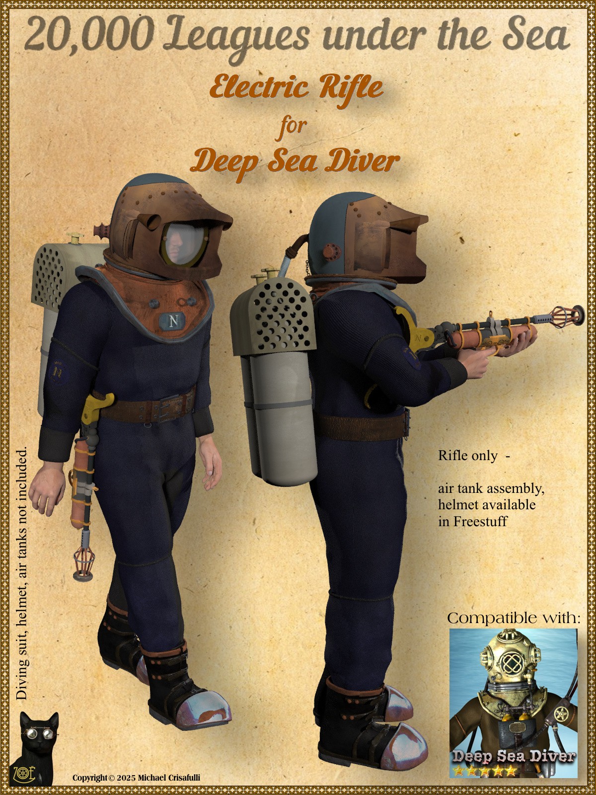 The divers in the 1954 classic film "20,000 Leagues Under the Sea" carried electric rifles for hunting and protection. I created this facsimile of the rifle as and for use in fan art. It's designed to work with the diving suit from Cybertenko's Deep Sea Diver, available in the Marketplace, but it works fine as a stand-alone prop.